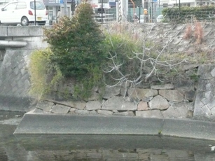 川岸から川中に向けて三角形に石垣を築き出し、川の流れを弱める役と、流れの方向を変えて三原城の「東築出」の用地を確保する為に造られた石積みと考えられます。流水の強く当たる所の大石には、それぞれに穴を開け、鉄棒を通して連結してあるそうです。このような特技を持った三原石工は、愛知県の宇和島に呼ばれ、その土地の干拓工事に手腕を発揮しましたが、その優れた技術の故に、かえって妬まれ、非業の最期を遂げました。これを哀れみ、その供養の盆踊りが彼の地に残っている由「白松克太三原昔話」。現在水刎は和久原川西岸の東大橋の川上に一ヶ所、川下に五ヶ所、上流の清水橋の川下にも二ヶ所残っております。三原志稿には延宝八年(1680年)水刎、塵除を設けるとの記事が見えますが、これは河原谷川の事かとも解されます。尚 三次市の浅野堤にも刎が造られていました。
